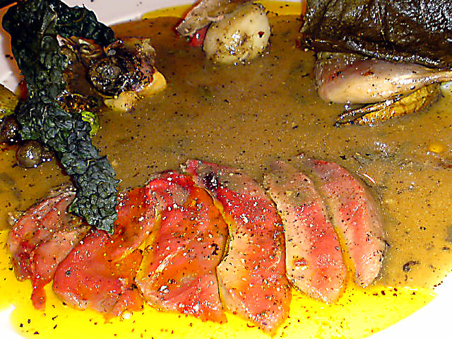 胸肉は限りなくレアでやわらかな食感。結構脂がのっているので、それをべースに、黒胡椒を利かせたソース。サルミではないので、意外とあっさり食べれます。