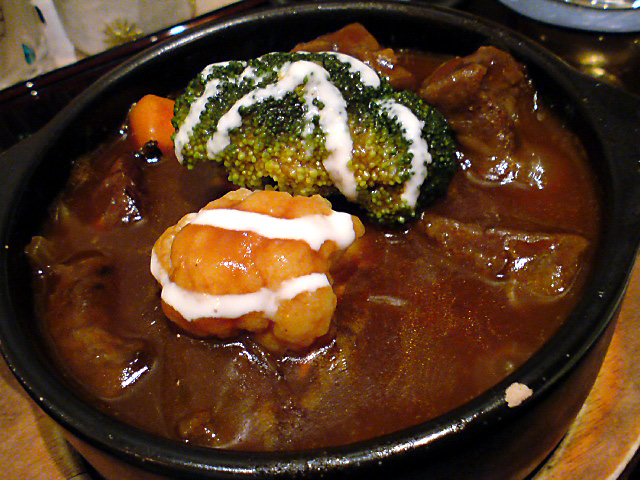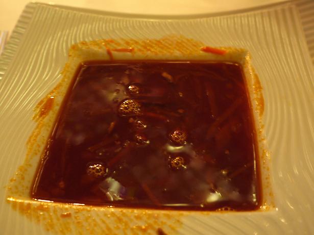 もう一つはランゴスティーヌを頼んだのですが、ないと言われ、ロブスターのアジアン風でいいかと言われたので、他のないですかと聞いたら、特製のボルシチを作るよと・・・ボルシチは普段夜は食べないものらしいですが、頂いてみたらまろやかなブイヨンと野菜の優しい味で美味しかったです。ポーションはどんぶり1杯くらいあるので1品をシェアすればよかったかも。