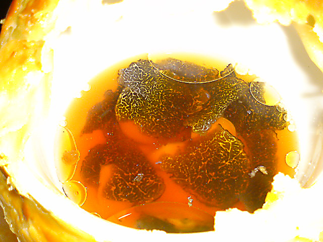 こんがり焼き上げたパイ包みの中には、濃厚なコンソメとトリュフがたっぷり。百合根などが入っています。パイを開けたとたん、芳醇な香りが漂ってきて幸せな気分になりました。幸せの1盃