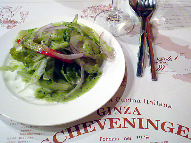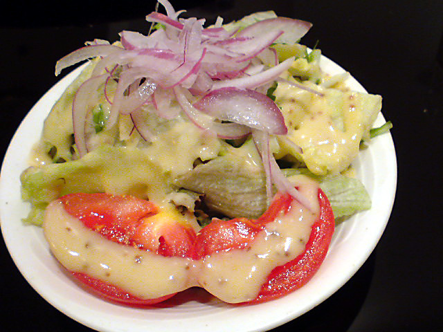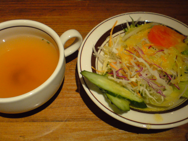 まずはビールでし。セットのサラダとスープが運ばれてきます。