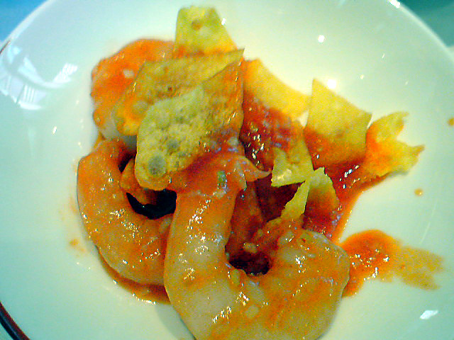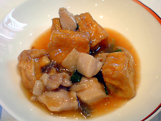 芝海老のチリソースと揚げ豆腐と鶏肉の煮込み