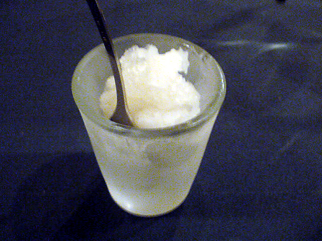甘酸っぱいグラニテが、氷をくり貫いた器の中に入っています。どうやって作るのか不思議でした。ドリルでくり貫くのかしら・・・