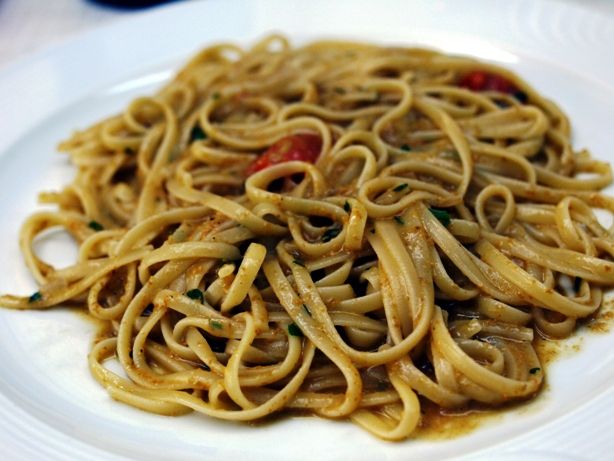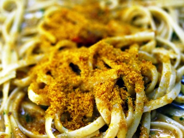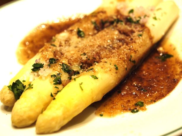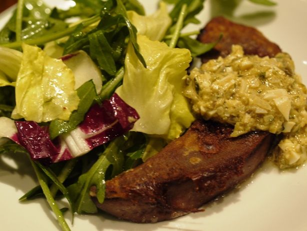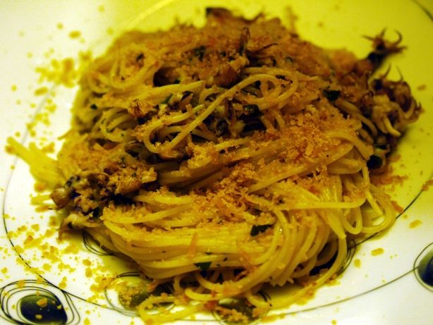 バターとヴィネガーのパン粉焼き。かなりガーリックが効いています。