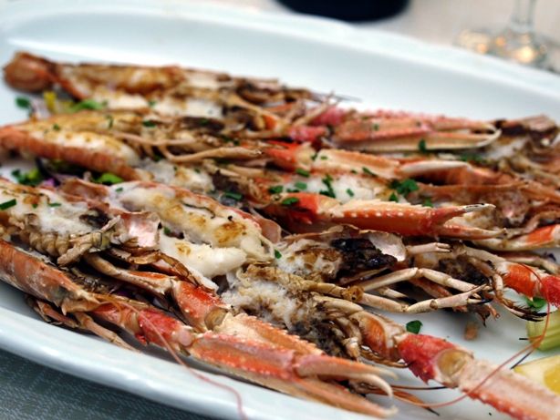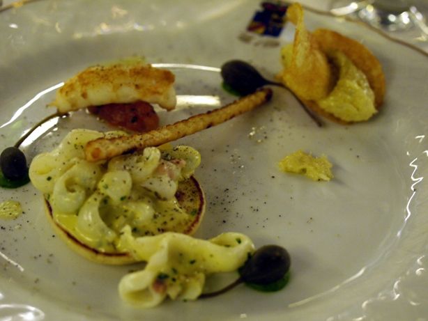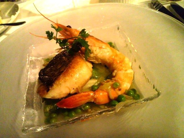 粗くたたいたスズキに、手長海老のローストとキャビアがのっています。
