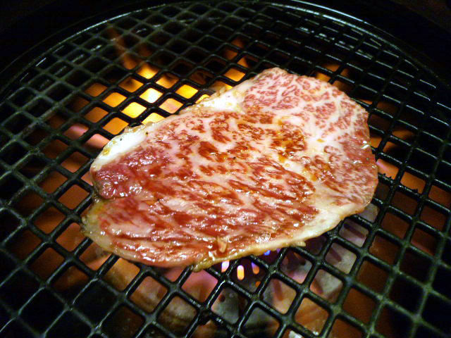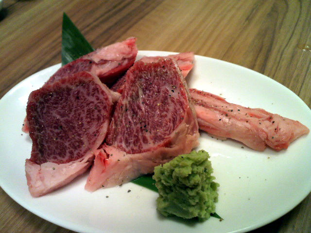周りは脂がありますが、厚切りで焼くと脂が落ちたあと肉がしまり、ジューシーな味わい。ワサビで頂きます。