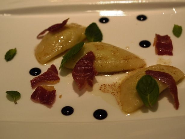 ニョッキというべきかラヴィオリというべきか。そら豆のムースとリコッタペコリーノが中に入っていて、焦がしバターのソース。生ハムをカリッと焼いたものとバルサミコ、そして、ミントの葉がアクセント。ミントが加わるだけでその味は奥深くなります。これは絶妙な今まで食べたニョッキで1番美味しかったかも。