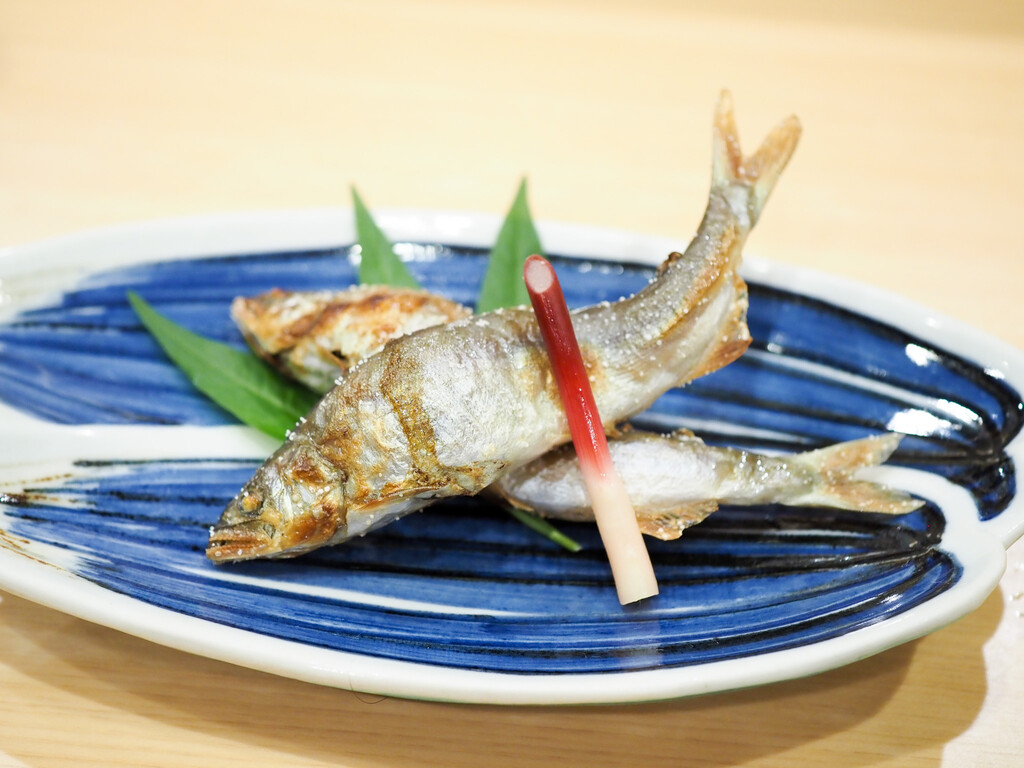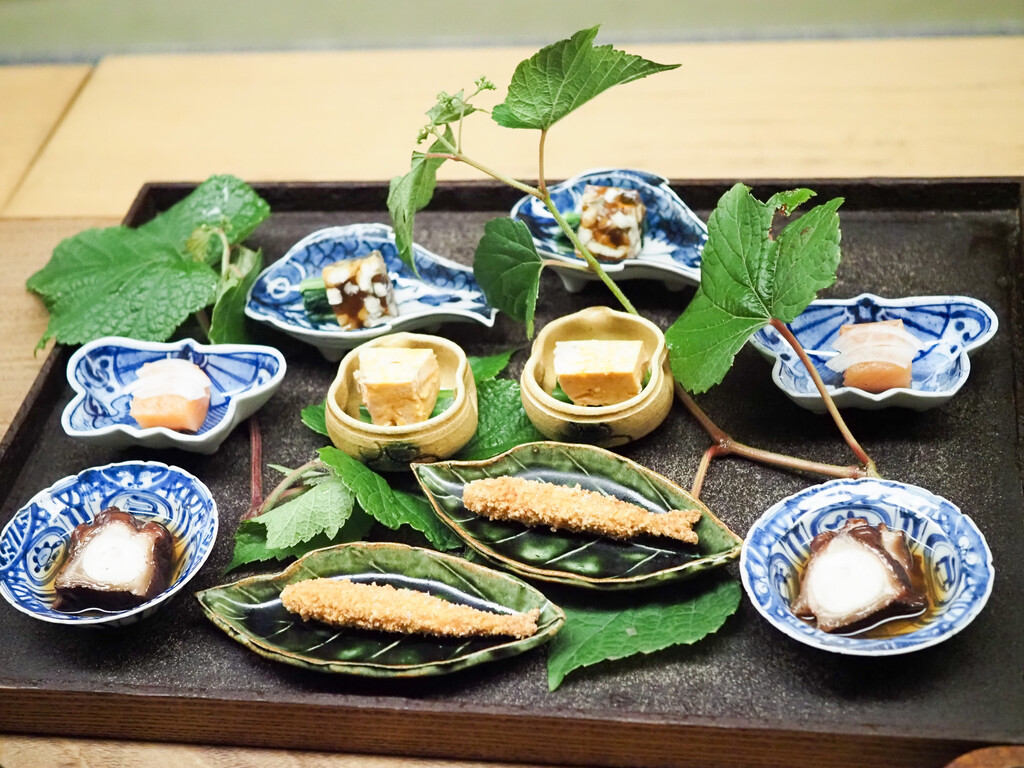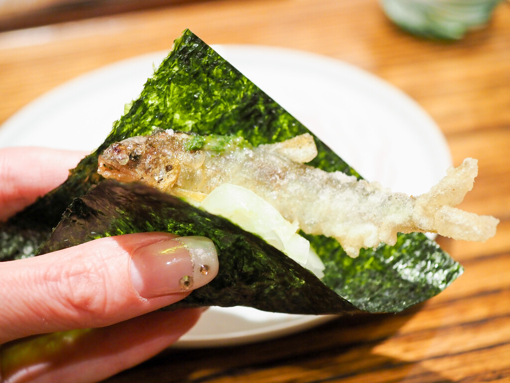 琵琶湖の稚鮎のおかき揚げ。あん肝にさやいんげん。