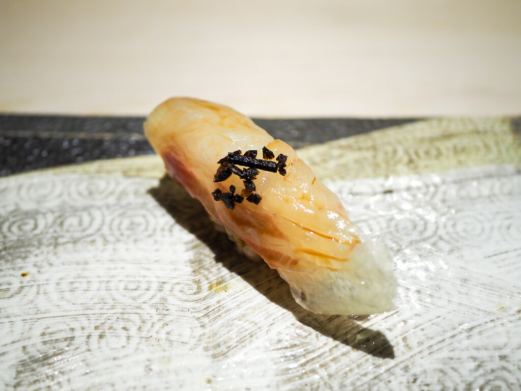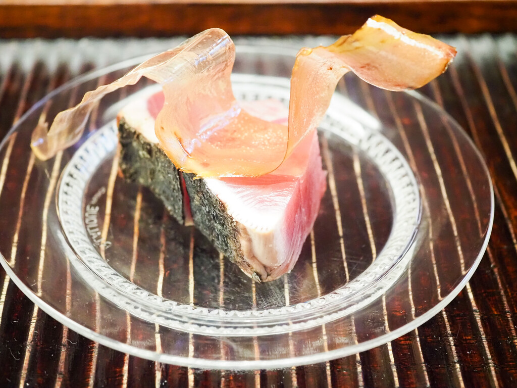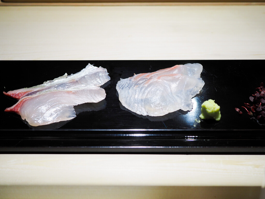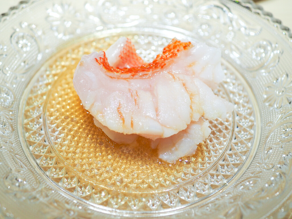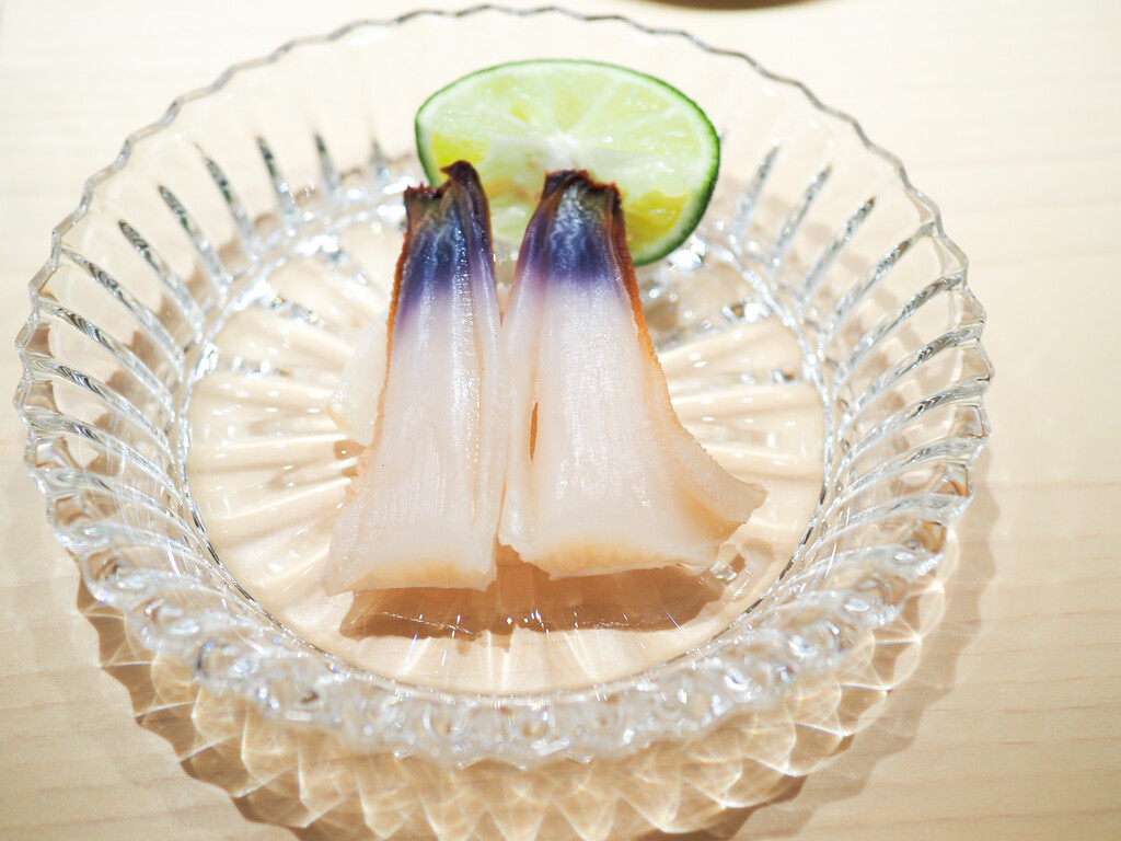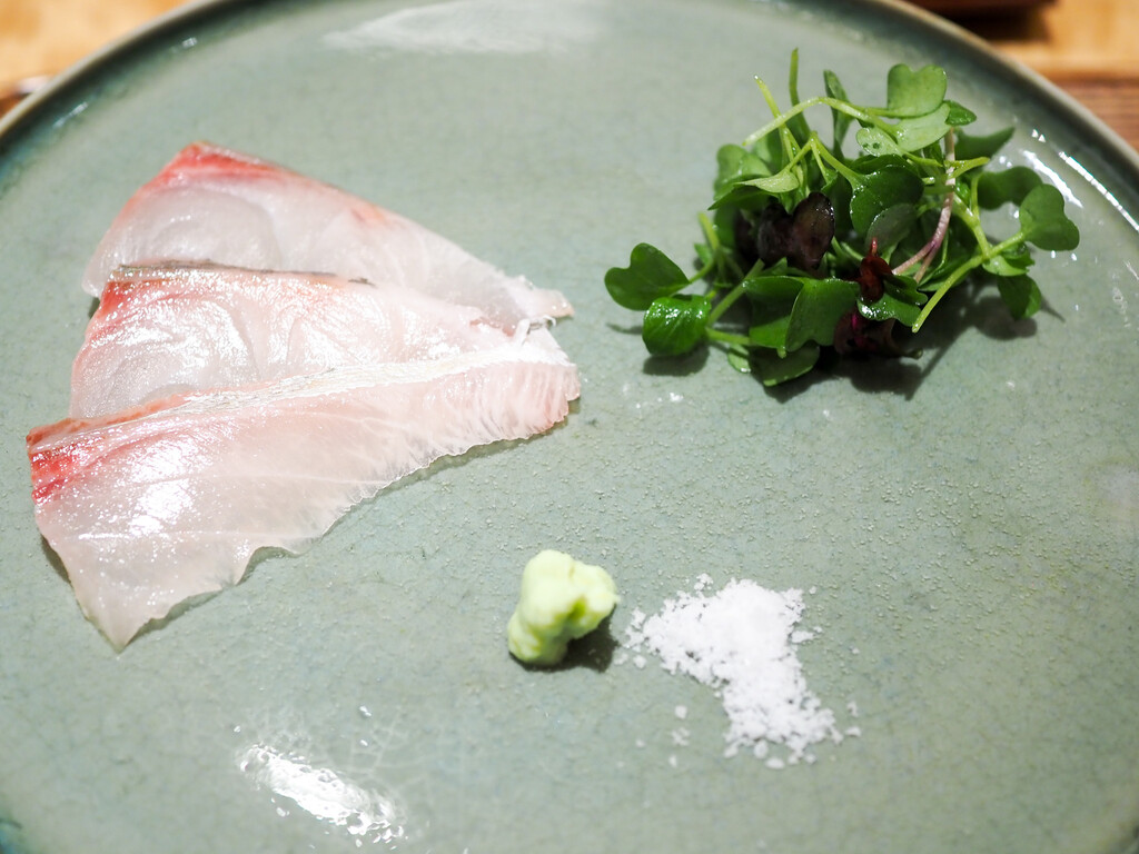 淡路のあこう(あずきはた)は、塩と柑橘がシンプルに旨味を引き立てます。皮も添えて。