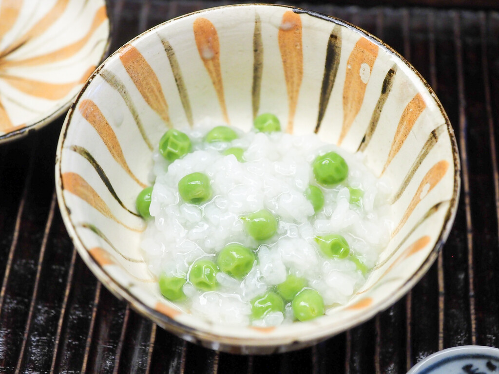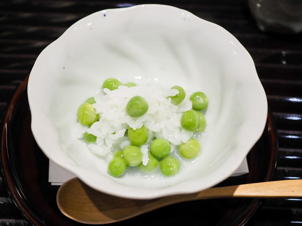 炊いたうすい豆とご飯に、蛤出汁と蕗の薹オイルをかけて。