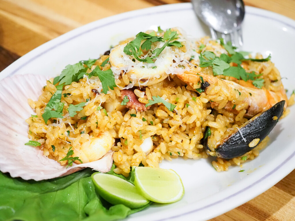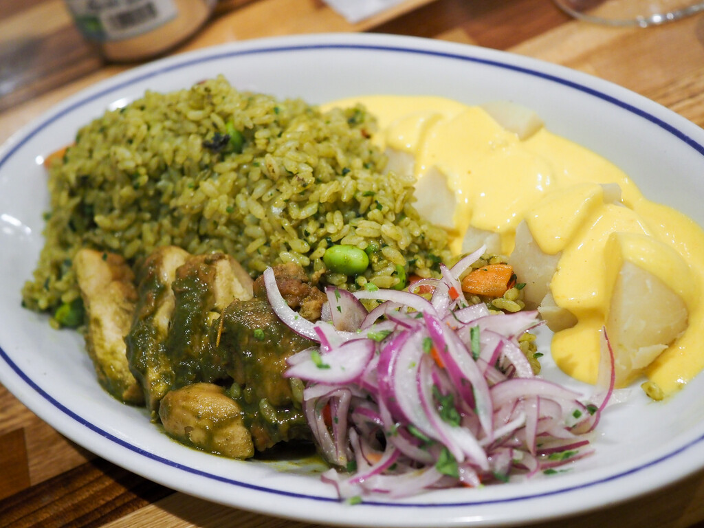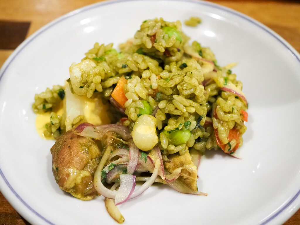 ムール貝や、海老、たこ、帆立など、魚介とアヒアマリージョ、アヒパンカを加え、ピラフのように炊いた米料理。パエリアっぽいけれど、米の質感は異なり唐辛子なども加わって、食堂でも食べられる、また違う魅力のあるペルーの定番料理です。