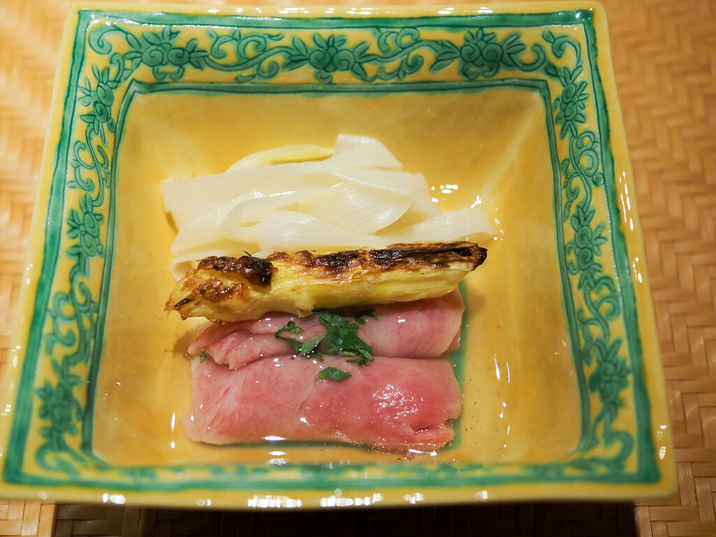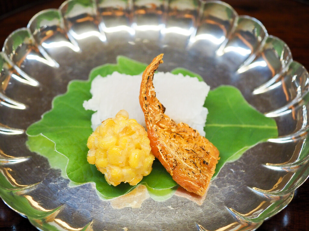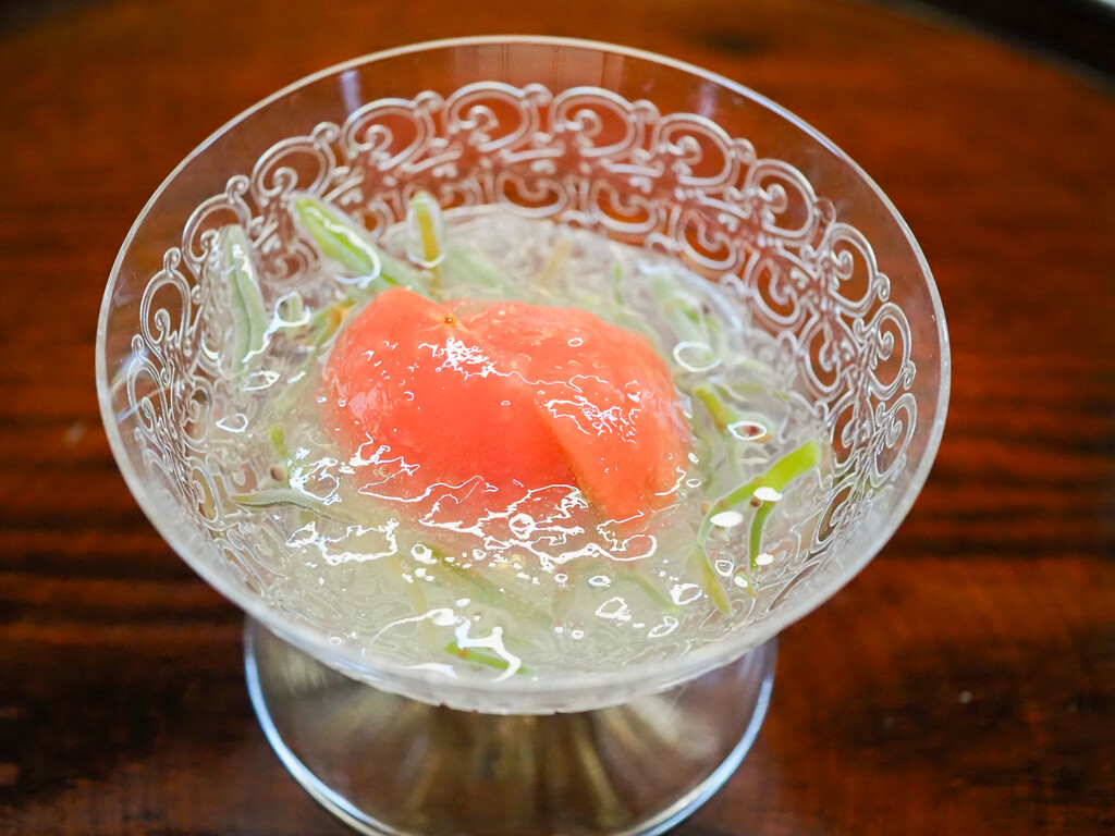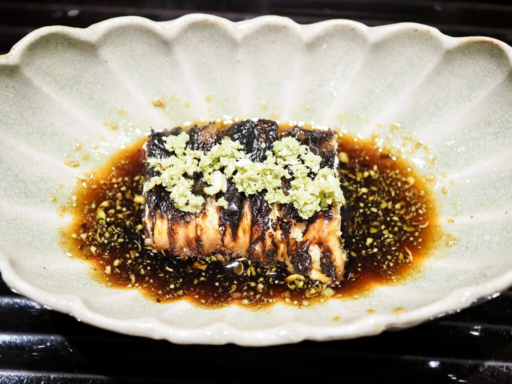 京都の岸本さんの賀茂茄子は、油通ししてから昆布出汁で炊いて、鮎魚醤をかすかなアクセントに。