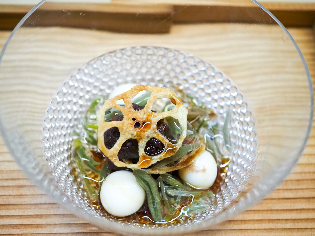 土佐酢のジュレがのどぐろと山菜のつなぎとなり、和の春巻になっています。