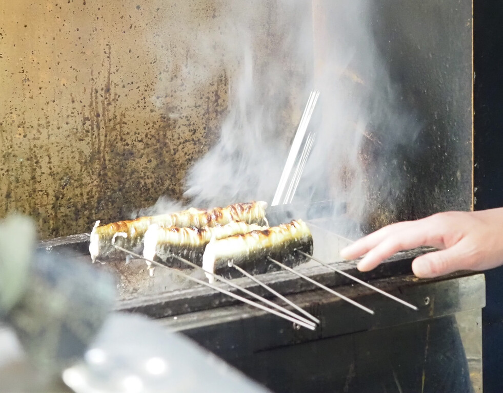 鰻は、ひっくり返して骨を抜いたものを、もう一度戻して筒型で炭火焼にします。