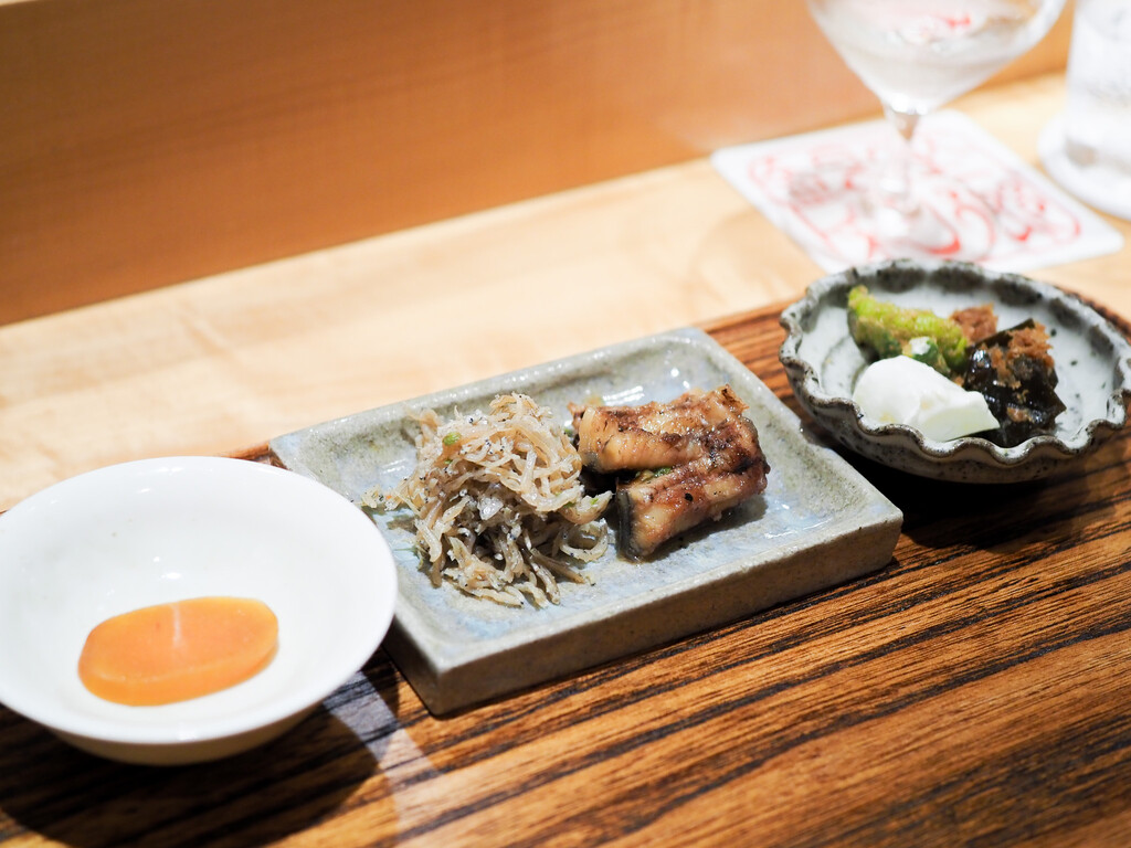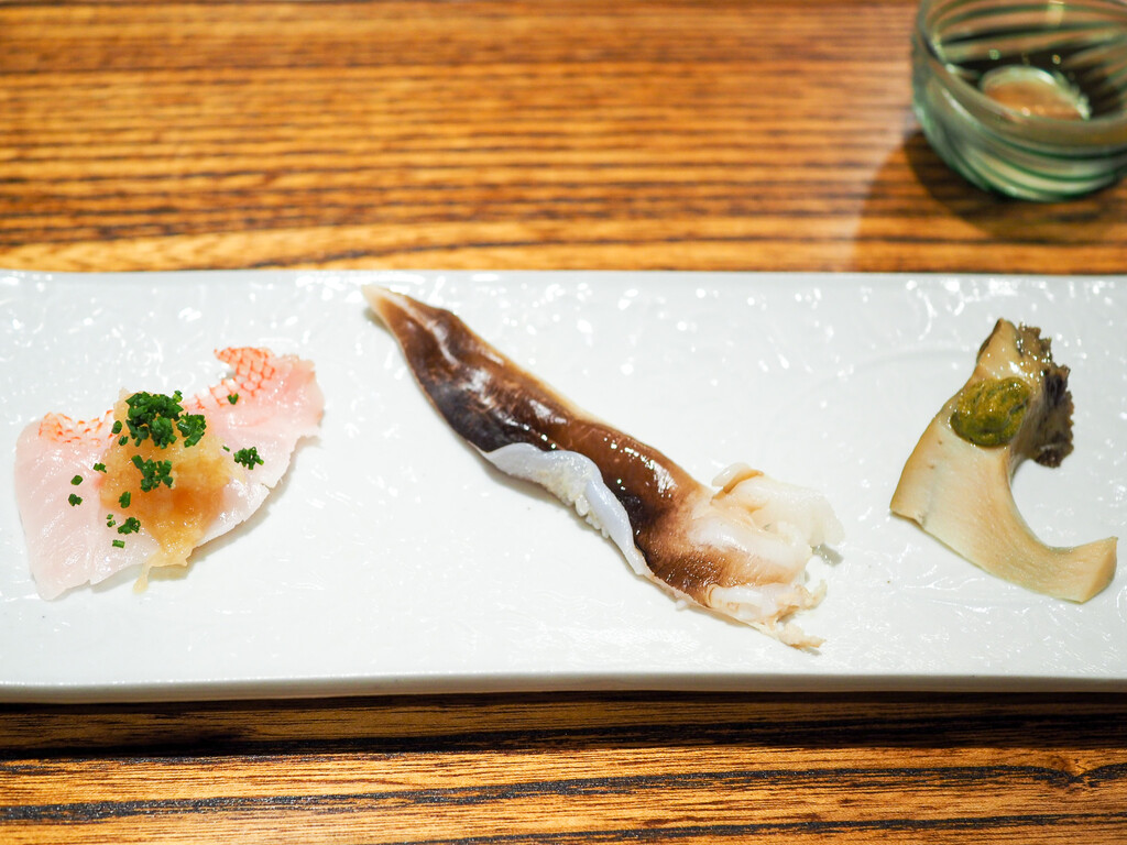 桜鱒の燻しと新玉葱。穴子の煮凝り。タコ煮。