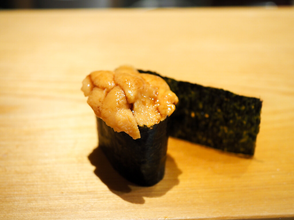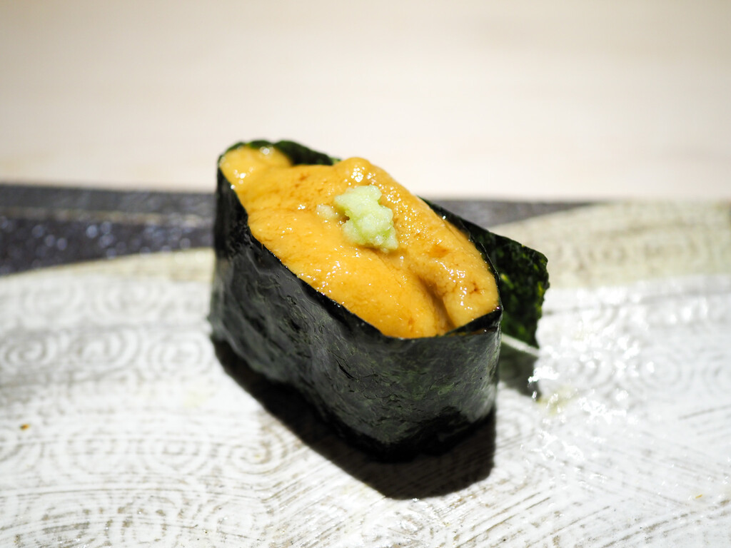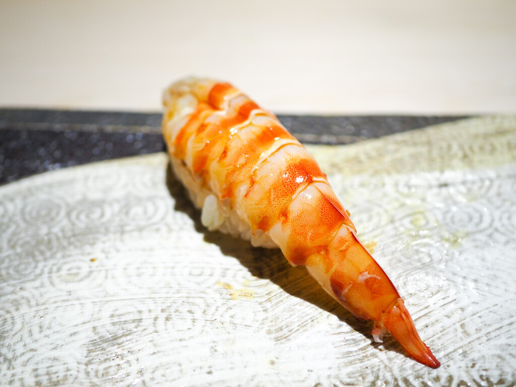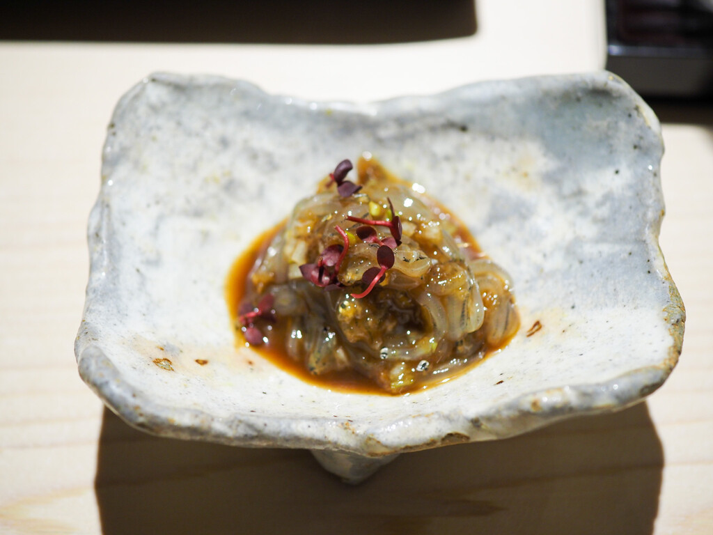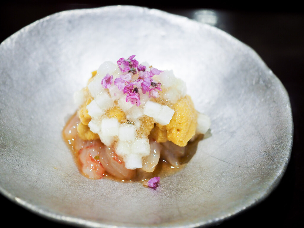 サロマ湖のしま海老と利尻の雲丹、角切りの長芋と花穂紫蘇。