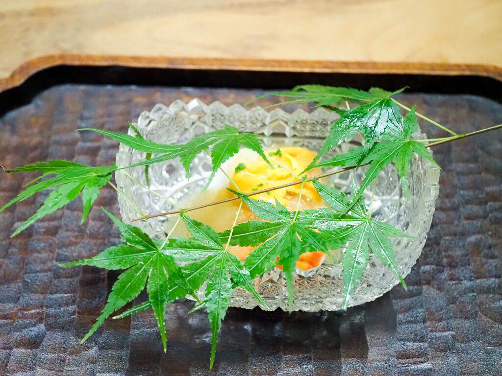 お店のお庭にある新緑の紅葉をのせて。