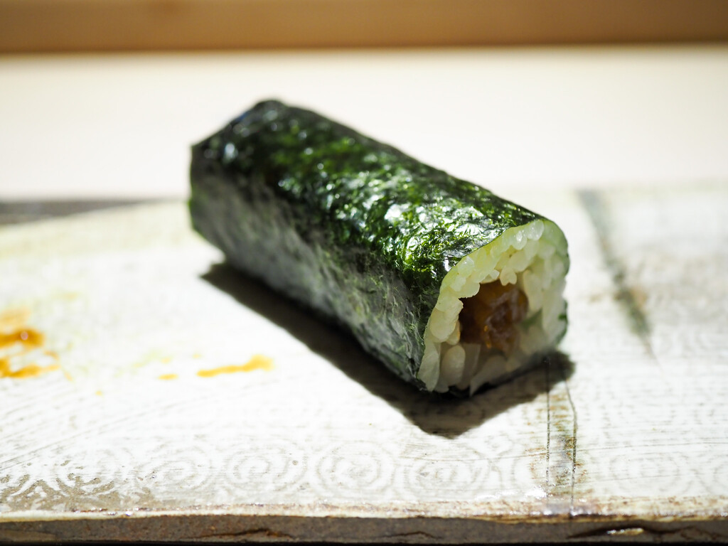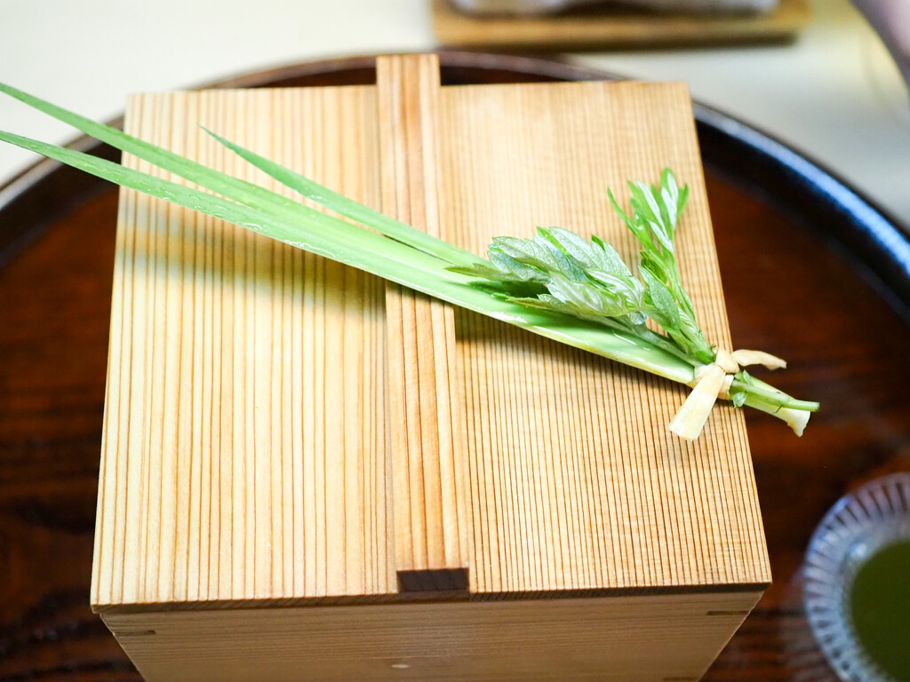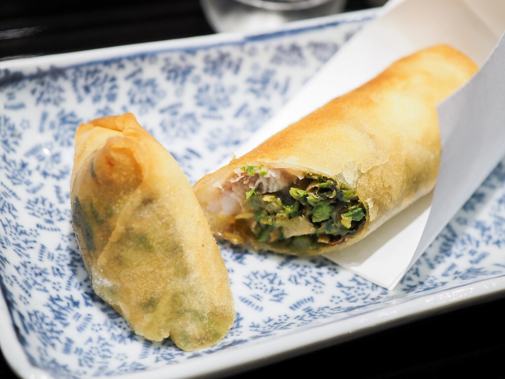 秋田の行者ニンニクやはりきりの芽、いたどり、のびるなど9種類の山菜を刻んで炒めたものと、のどぐろ、土佐酢のジュレの春巻。