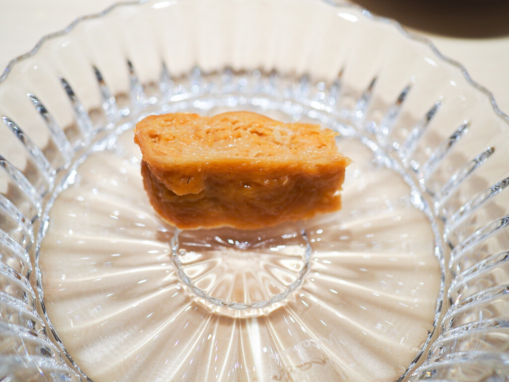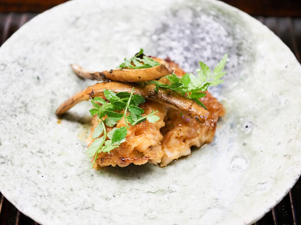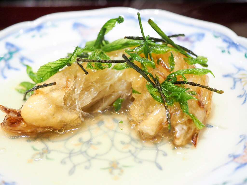 肉厚で繊維の太い中心部分を揚げて、ほぐしながら、すっぽんのお出汁餡を沁みさせて。