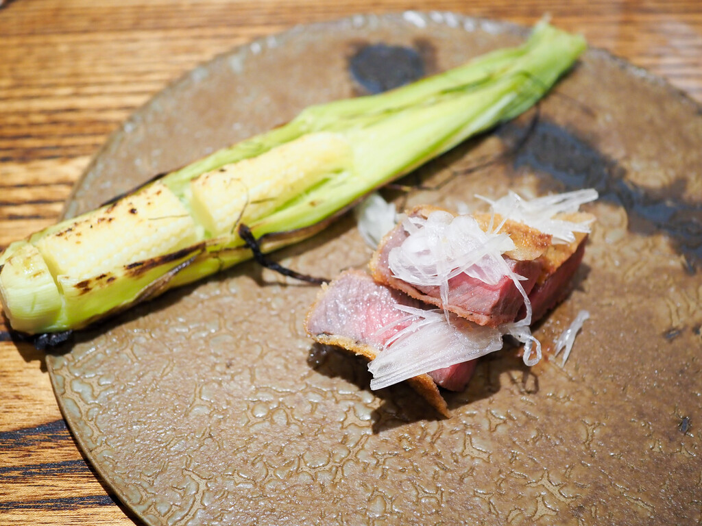 宮崎牛のシャトーブリアンは、表面をさっと焼いたものを手でちぎって。