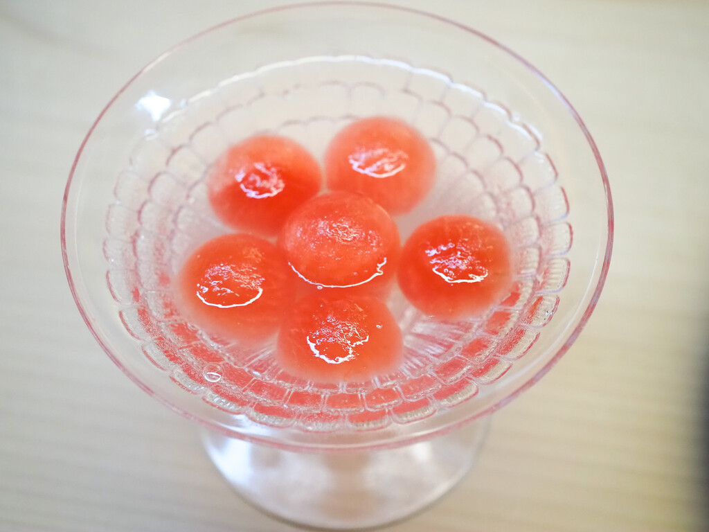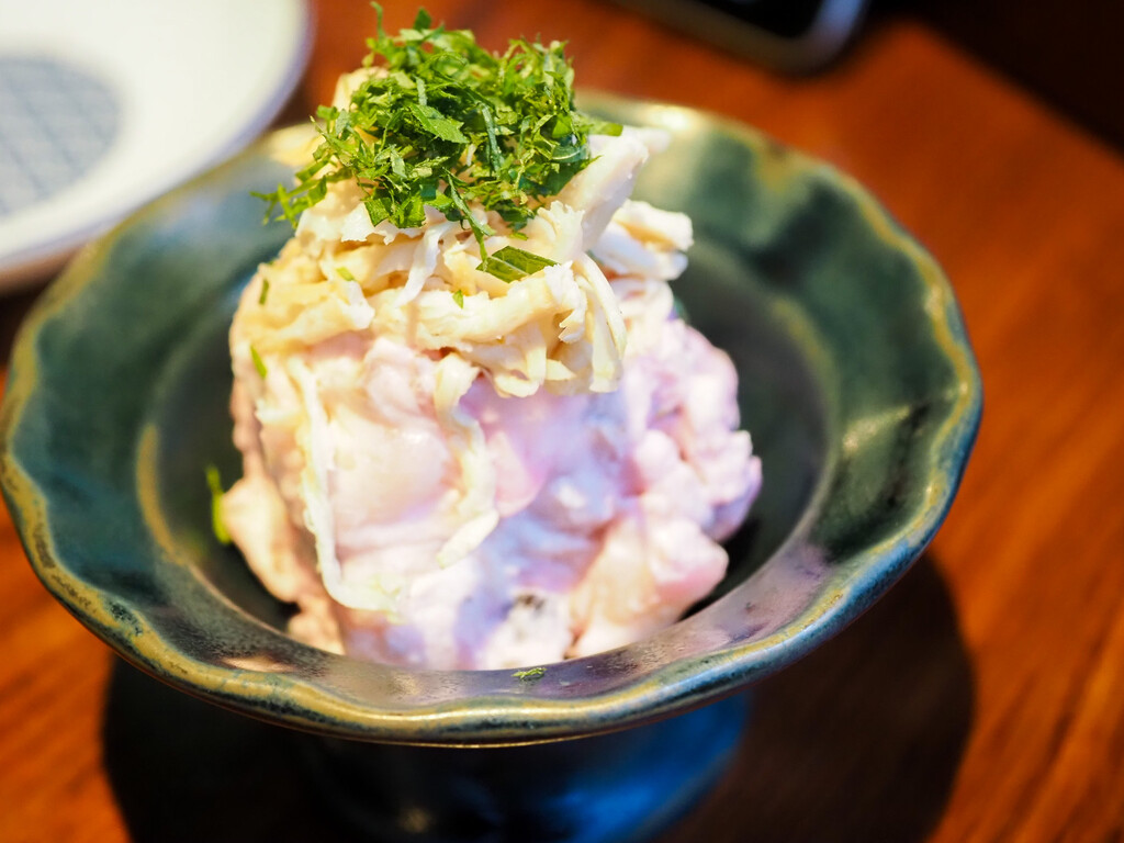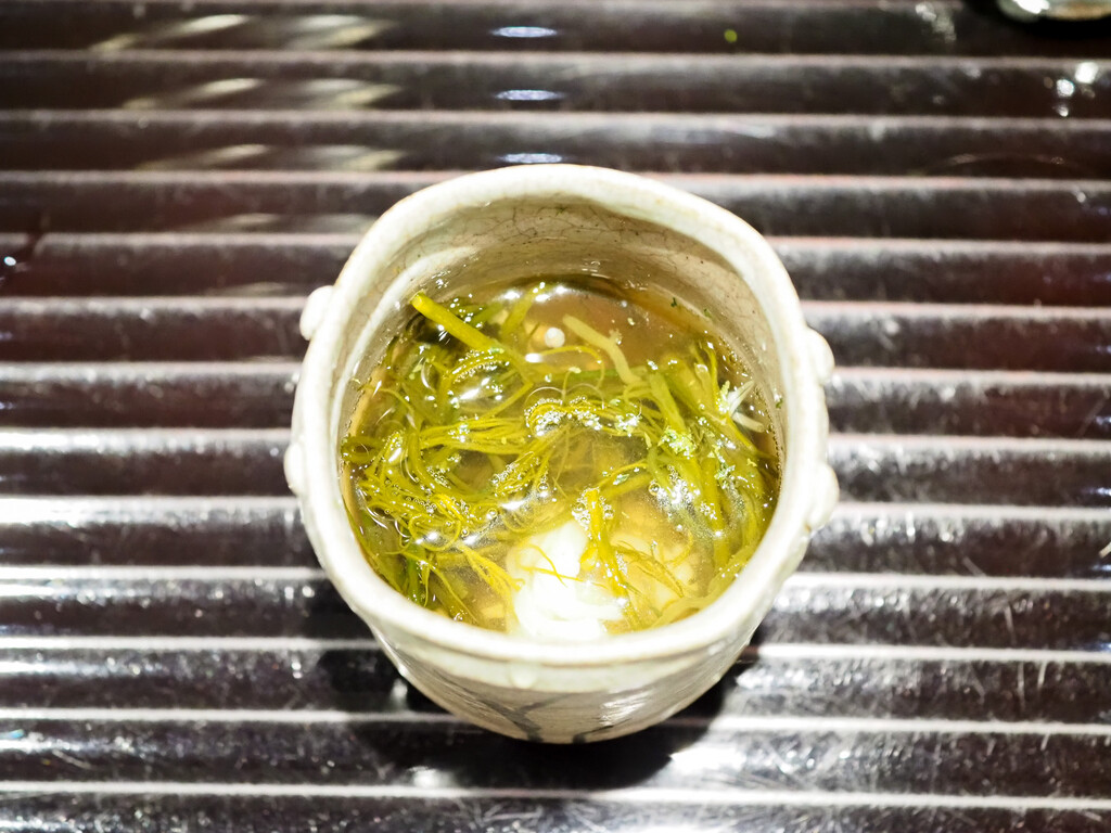 細切りにした白イカと、黒もという海藻、広島のじゅんさいを三杯酢のつゆで。