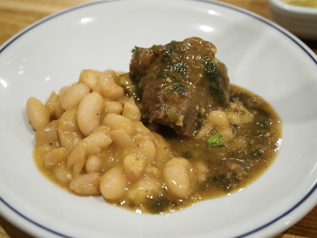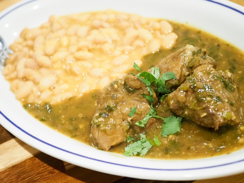 ペルー北部では、カプリートという仔山羊を煮込む料理ですが、仔山羊はなかなか手に入らないので、仔羊で。小葱やアヒアマリーヨという黄色唐辛子と香味野菜、チチャデホラというとうもろこしのどぶろくで煮込んで。カナリオ豆の煮込みと共に。