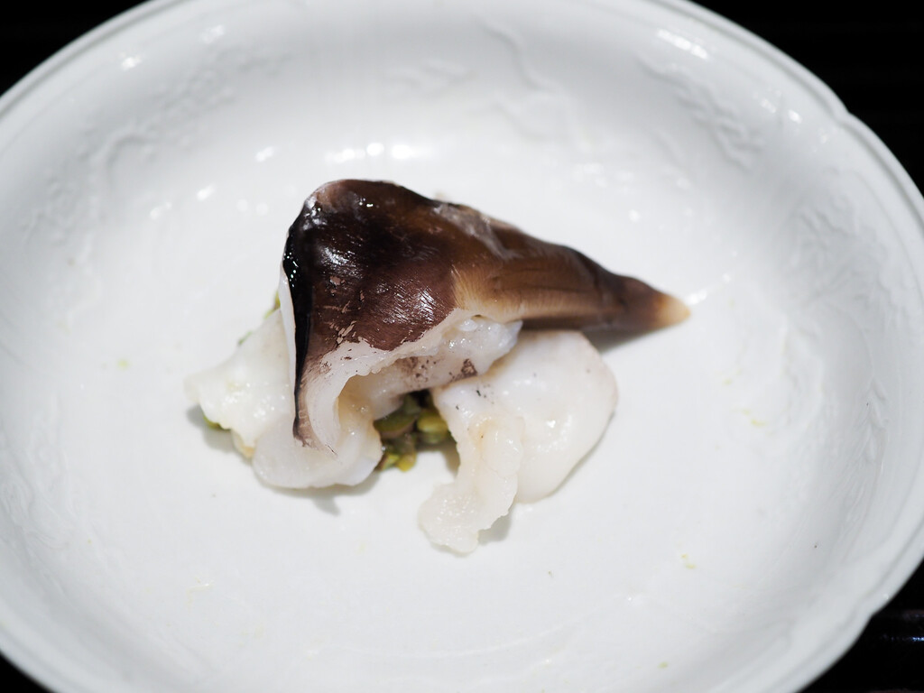 京都のとり貝は、内側をさっと炙って、たたいた蕨と共に。