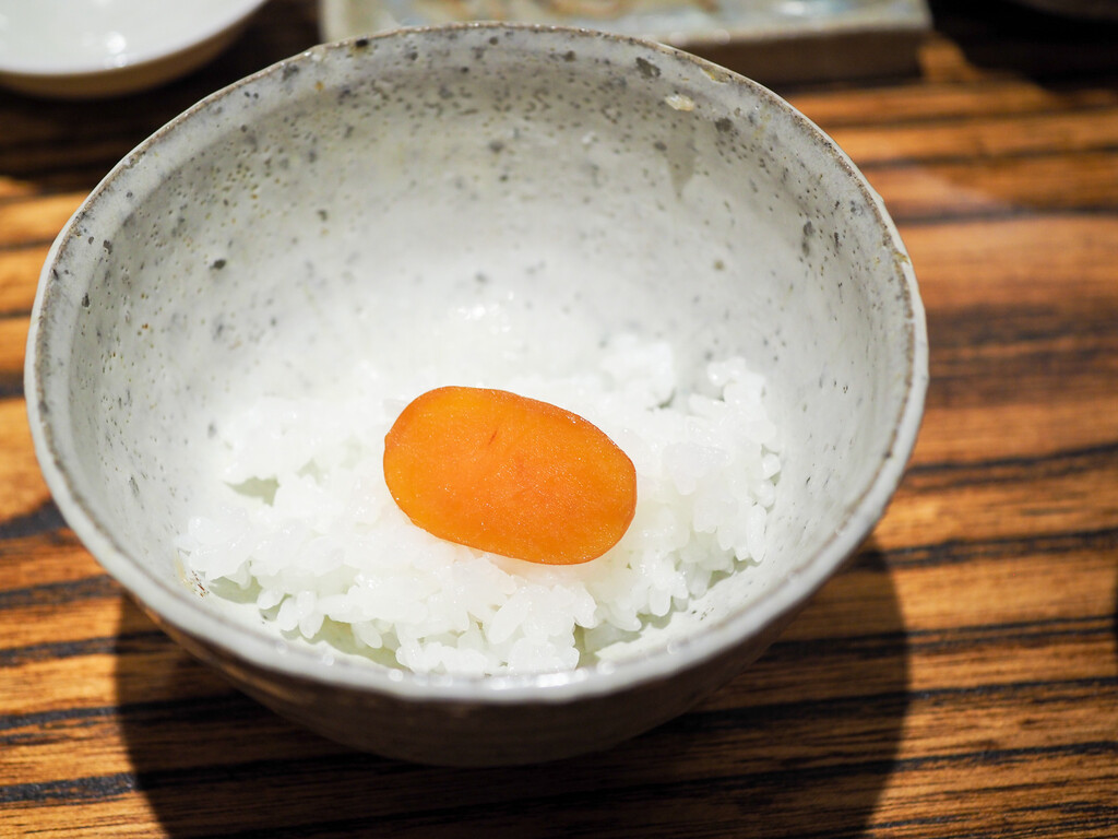 赤玉ねぎと唐辛子やパクチーのマリネ合わせながら、その肉汁を含んだお米が絶妙な味わいで美味しかったです。