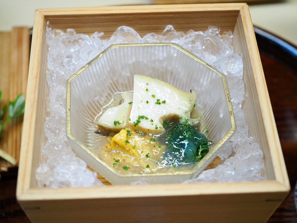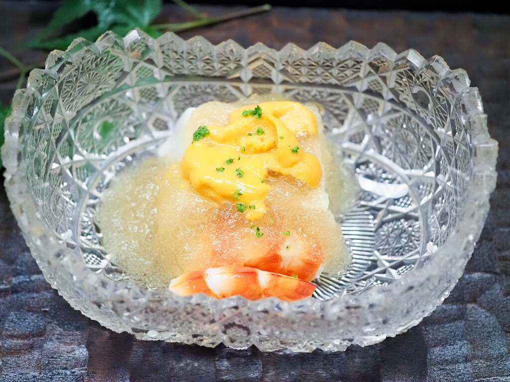 胡麻豆腐に、雲丹、車海老、出汁ジュレ。