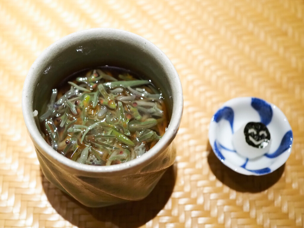 九十九里の煮蛤と刻んだ新生姜を蛤出汁で炊いて、煮詰めをかけ、木の芽をのせて。