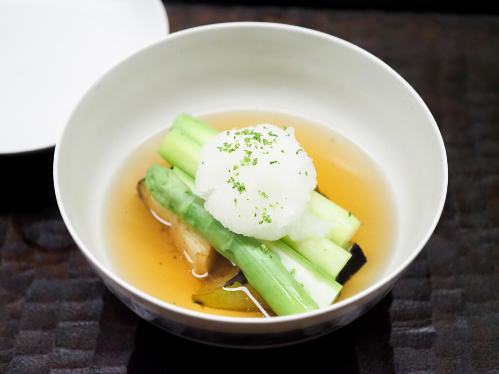 賀茂茄子の揚げ浸しに、グリーンアスパラガスと大根おろしをのせて。