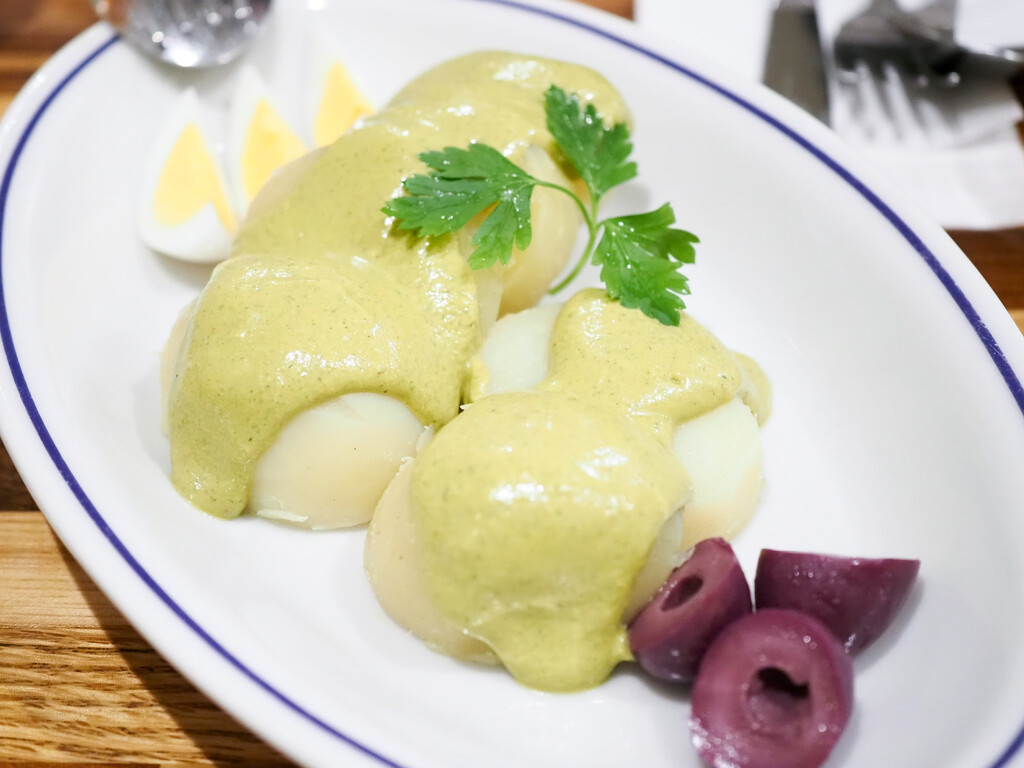 パパ・ア・ラ・ワンカイナにも似たジャガイモ料理ですが、茹でたジャガイモの上に、ワカタイというハーブと炒めた玉ねぎやニンニク、ピーナッツ、ミルク、チーズ、アヒ・アマリーヨなどを加えたソースをかけて。ゆで卵と紫オリーブを添えて。