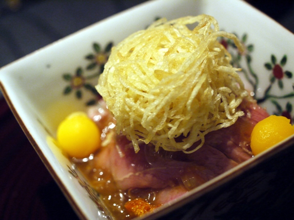 軽く湯引きした程度の厚切りロース牛肉に、千切りのジャガイモのフライをのせてあります。下には玉ねぎを煮たものやお汁があって、崩しながら混ぜて食べてくださいとのこと。高級な肉じゃがです。