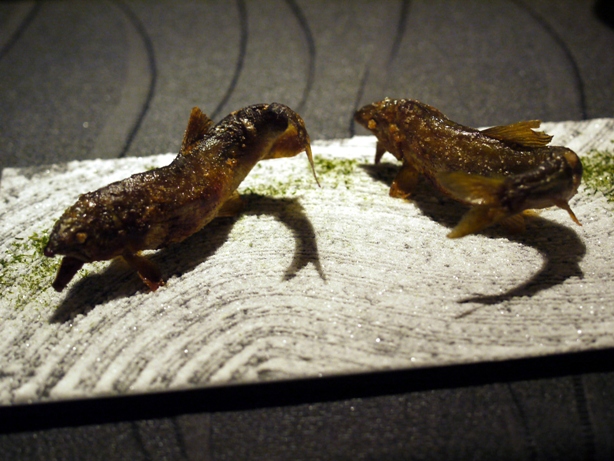 炭火と笹の葉で焼かれた稚鮎は、頭を下にして焼くそうで、脂が頭にのぼり、カリッとジューシーに。身もふっくらしています。尻尾は干物のように。赤たでにスイカを合わせたソースと頂きます。