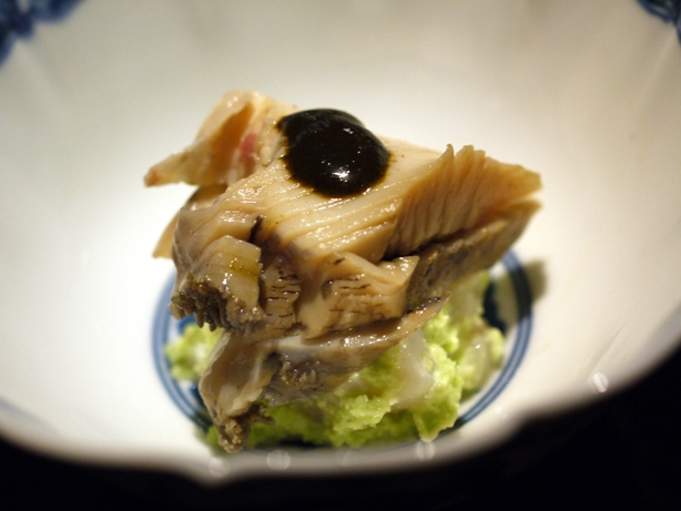 限りなくレアな蒸し鮑に、肝ソースがかかり、だだちゃ豆と白随喜の風味と食感がいいです。