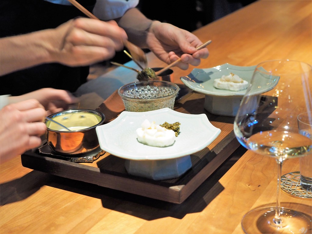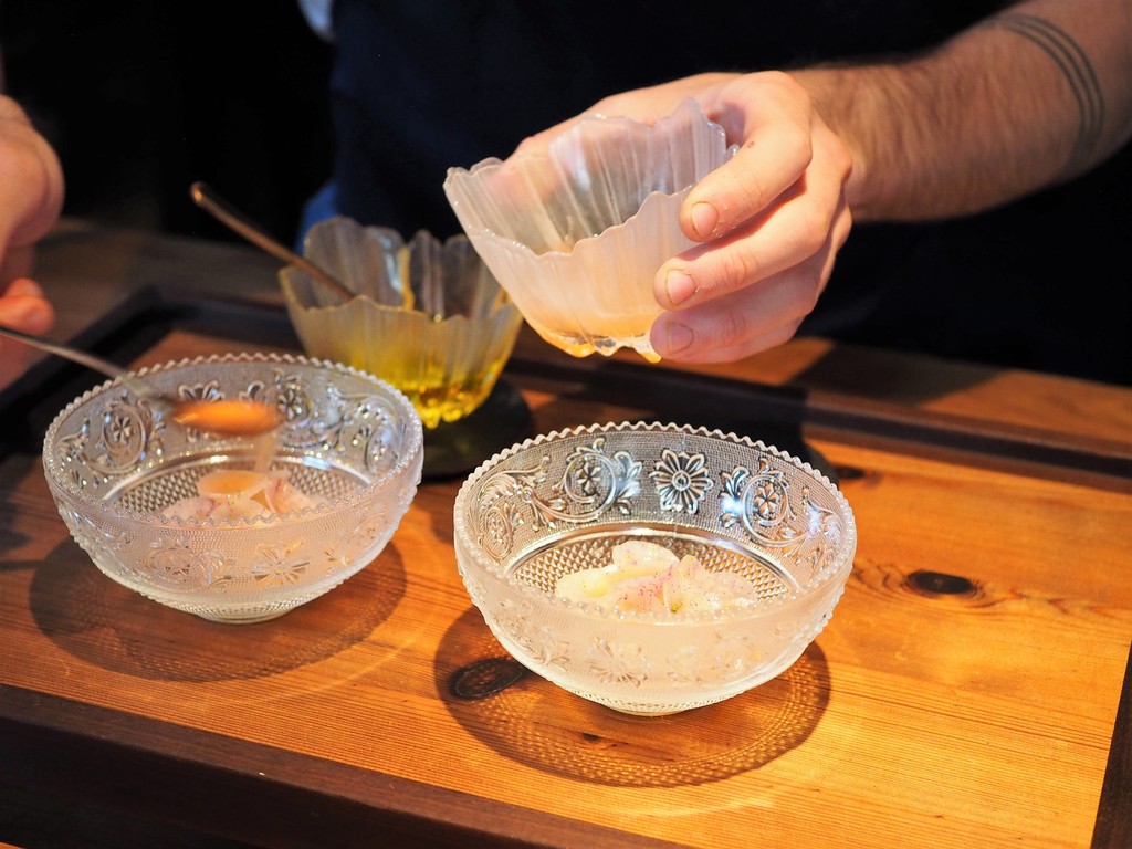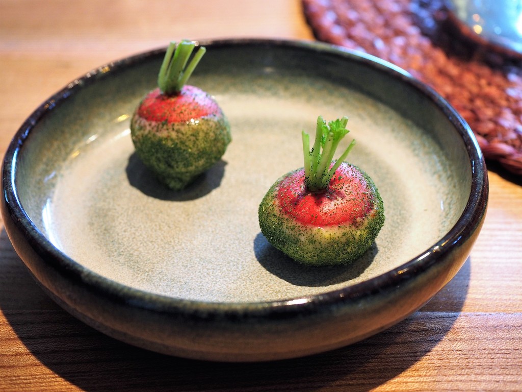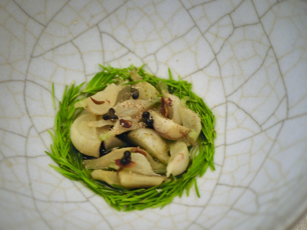Scallop marinated in shellfish garam,radish from Oaxen farm ,labrador tea & buttermilk