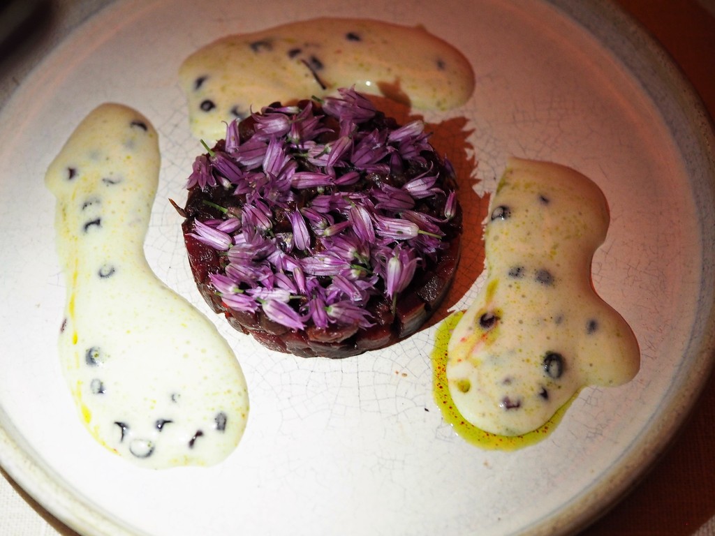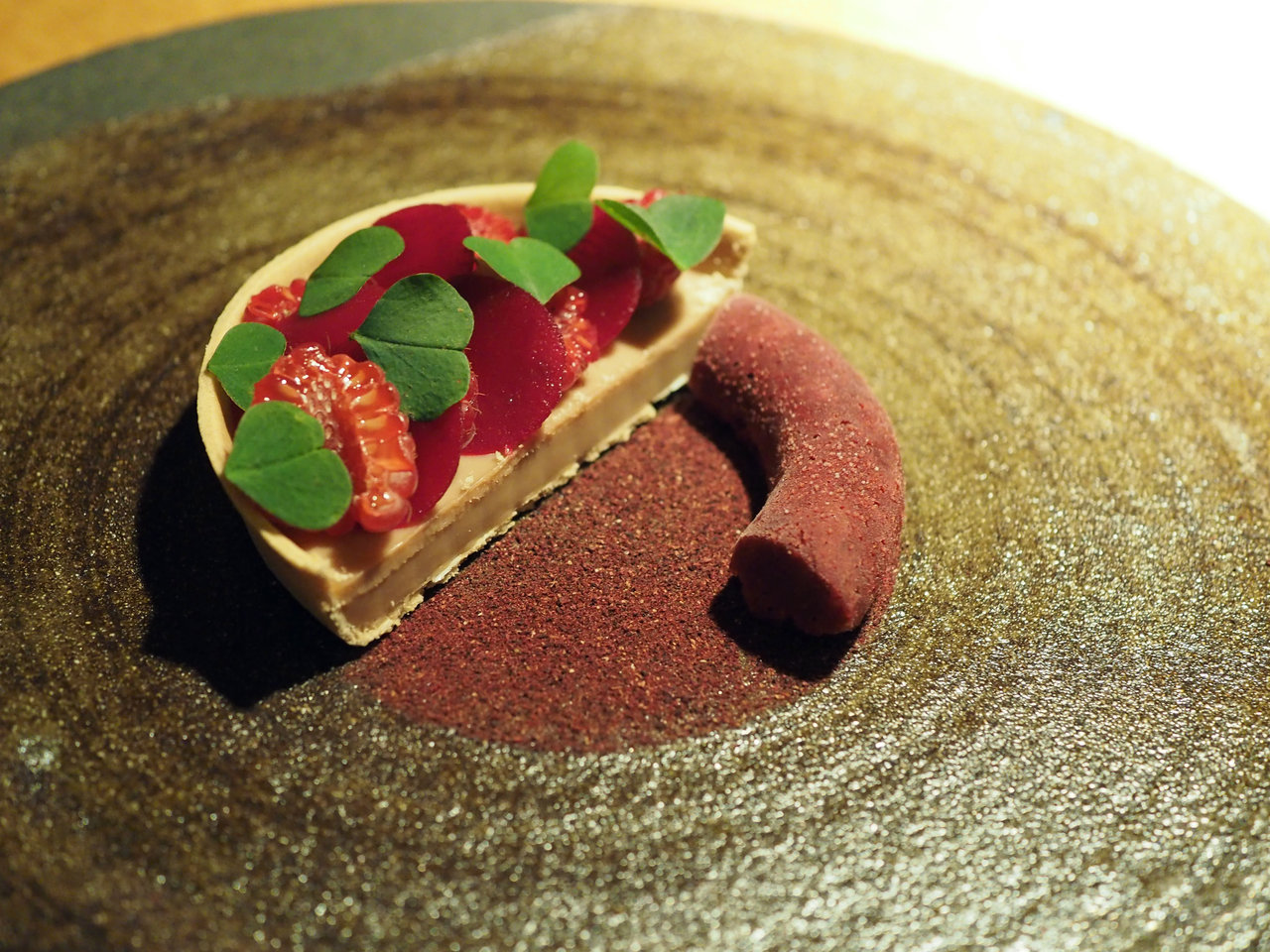Tartelette with caramel,raspberries,beetroots & arena sorbet