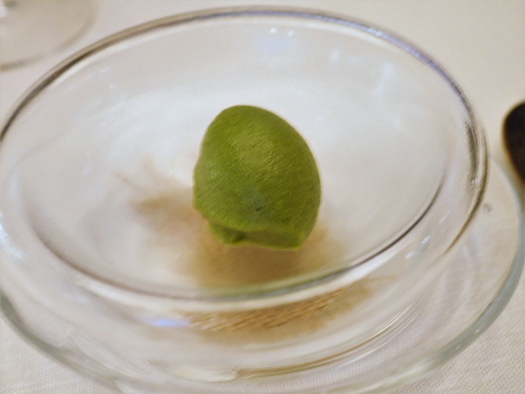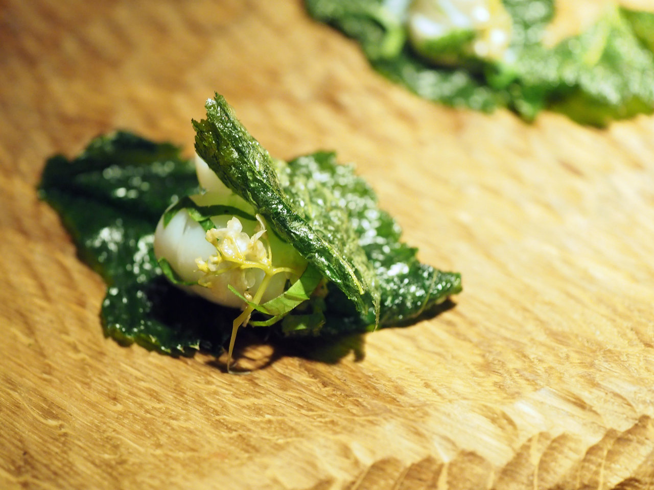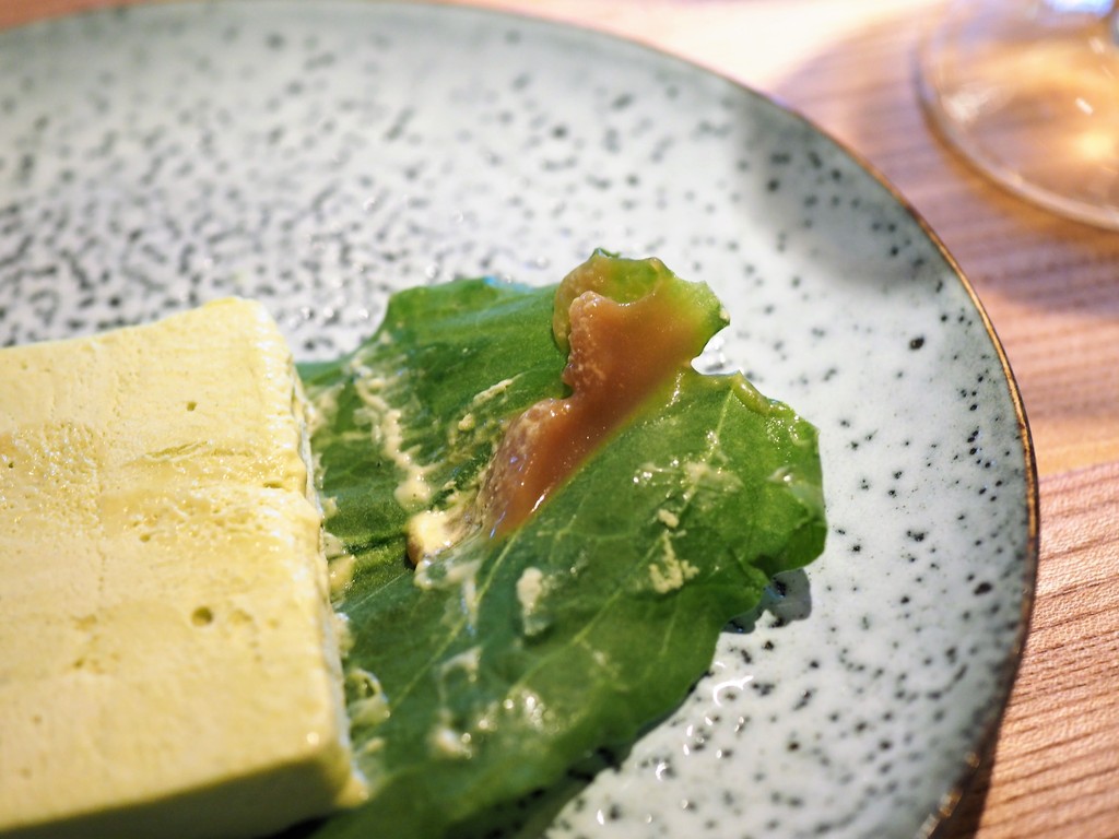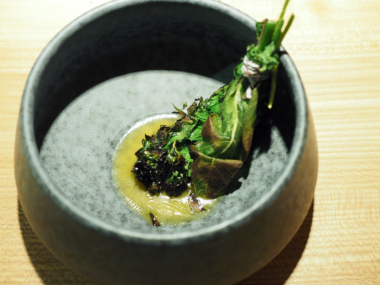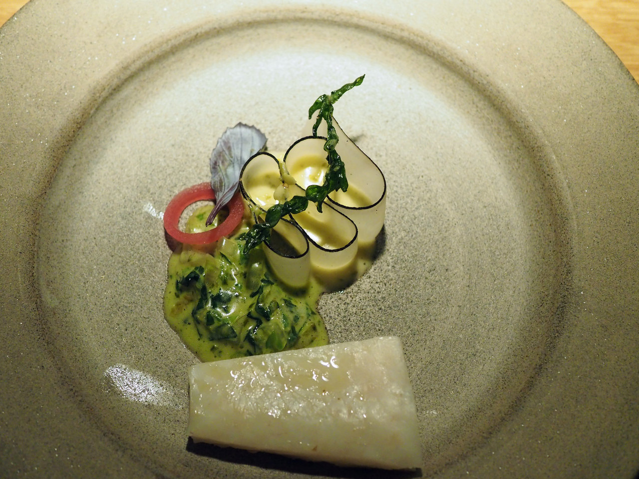 Roasted fresh cabbage in poteto miso,hazelnut forest leaves & sourd jerusalem artichoke cream