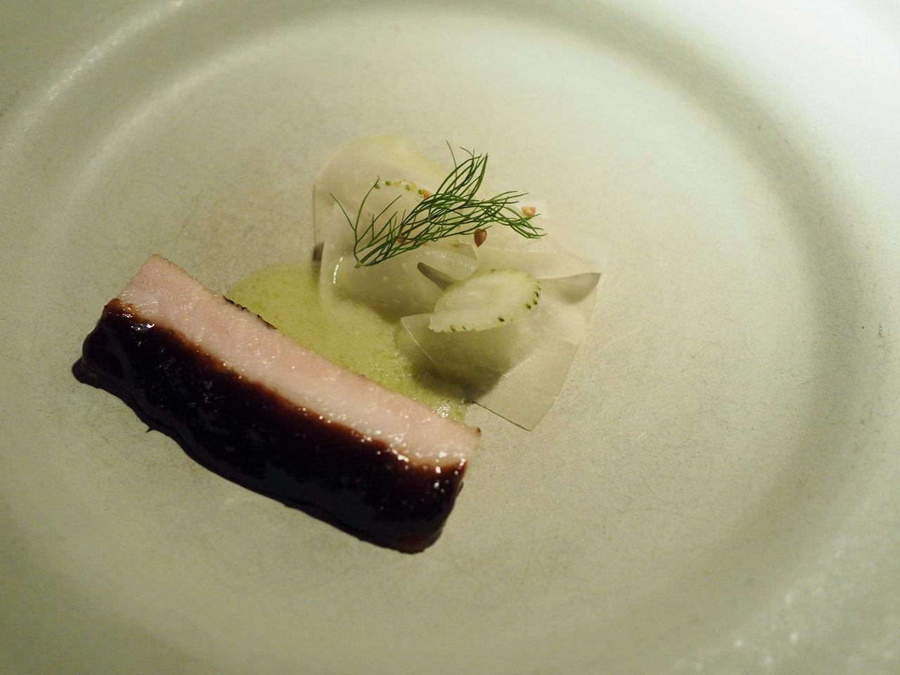 Swedish secreto glazed in fermented beef, koulrabi & green strawberries with dill
